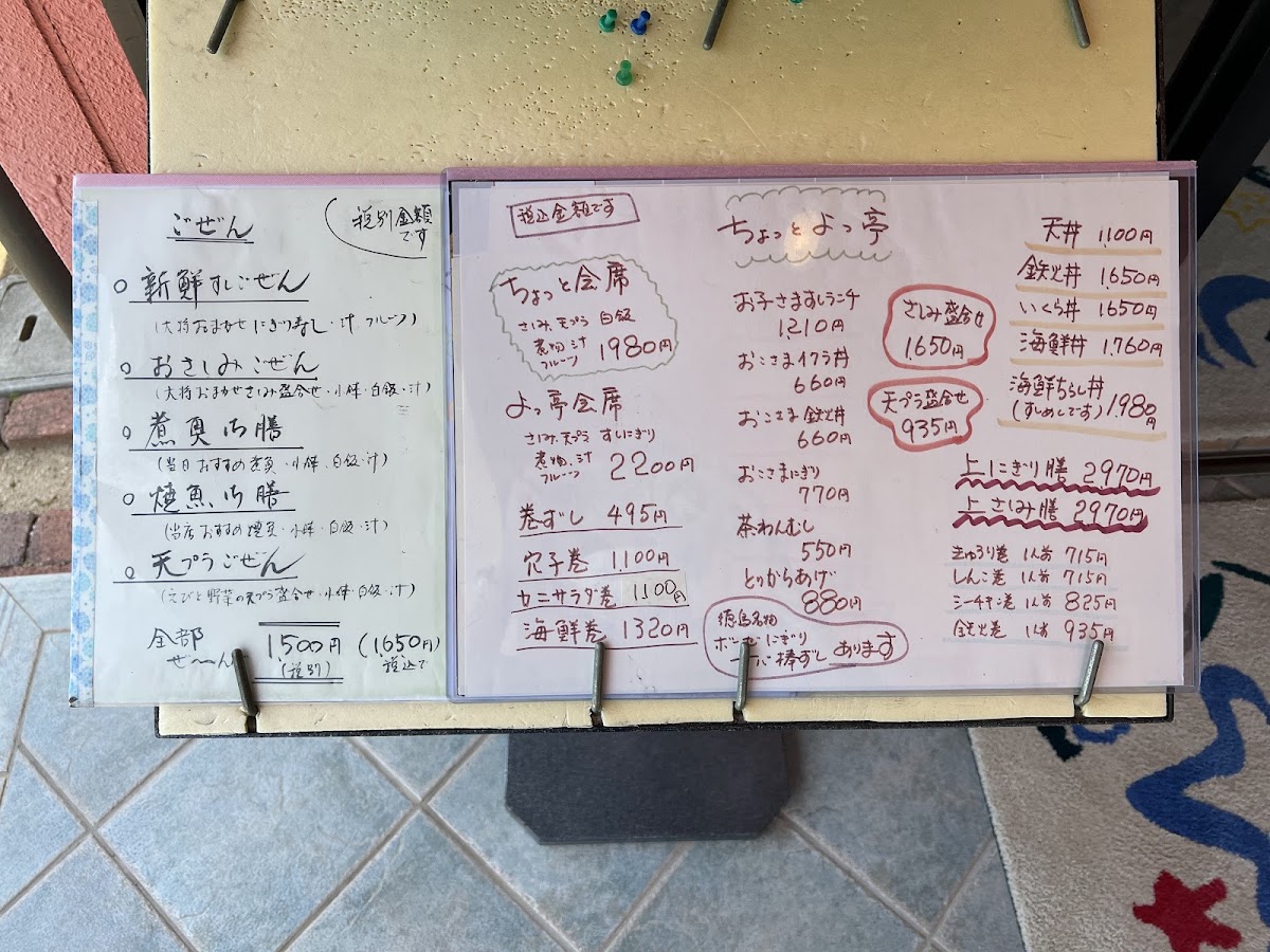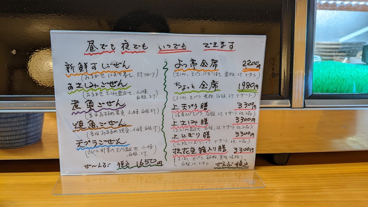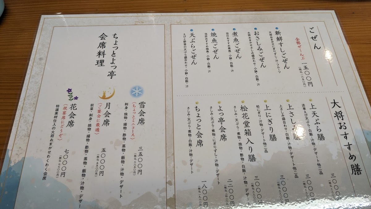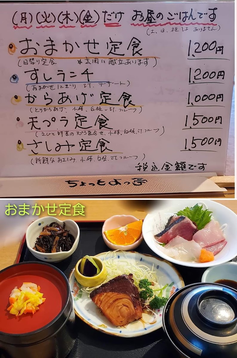 The menu at Chotto Yottei feels carefully curated to showcase seasonal seafood and comforting Japanese set meals, with a balance between everyday lunches and more refined dining options. For lunchtime, choices like かおまかせ定食 お昼のランチ, 日替り ランチ, and 今日のおまかせランチ offer variety and a sense of surprise, reflecting the kitchen’s daily selections. Those looking for something classic and satisfying can turn to すしランチ, 海鮮丼, or 刺身 定食, all of which highlight freshness and simplicity without unnecessary embellishment. The range of set meals such as ちょっと定食, よっ亭定食, 唐揚げ定食, 天ぷら定食, 牡蠣フライ定食, and 煮魚御前 makes the menu approachable, especially for diners who prefer a complete, well-balanced tray with rice, soup, and main dish. On the more elaborate side, よっ亭会席 and traditional 懐石料理 demonstrate a more formal style of Japanese dining, focusing on presentation and seasonal flow. Individual dishes like 鱧の湯引き, エビの天ぷら, and フグの雑炊 stand out as specialty items that suggest both skill and regional influence, while staples such as 赤だし quietly complete the meal. The inclusion of 寿司竹 and お弁当 adds flexibility for different dining needs, whether eating in or taking away. Overall, the menu leaves a strong impression of consistency and thoughtful variety, appealing equally to casual lunch diners and those seeking a more traditional Japanese dining experience.